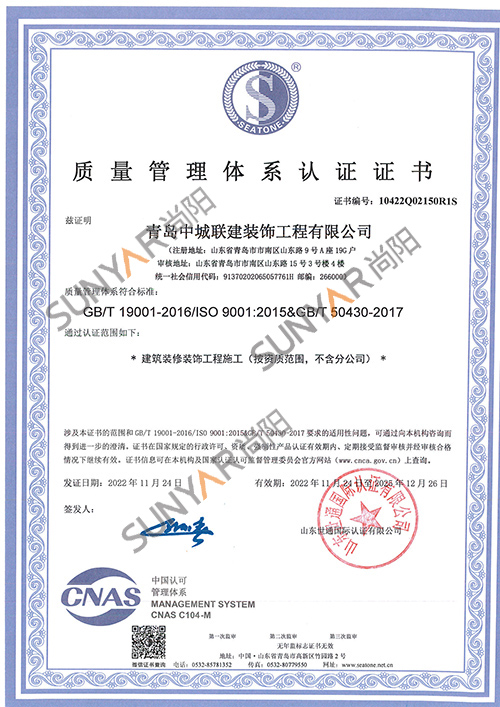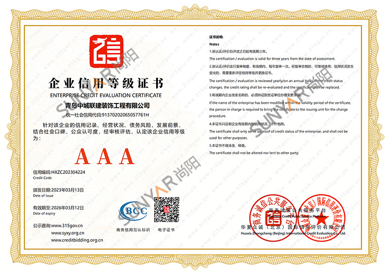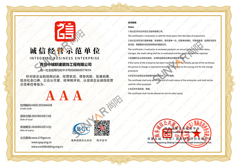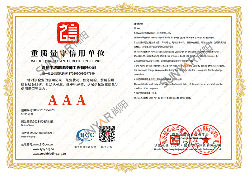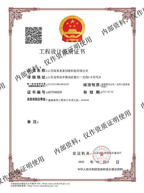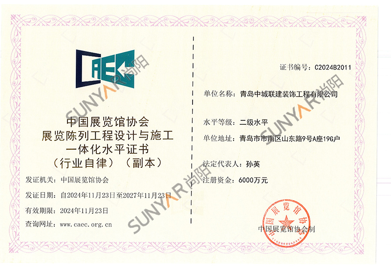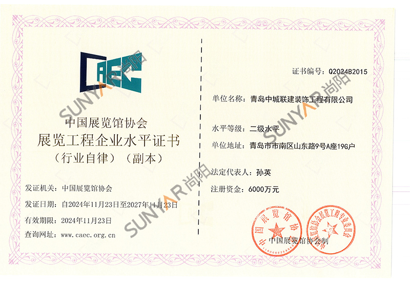 公司成立至今陆续通过青岛市高新技术企业认定、建筑装饰装修工程一级资质、设计资质乙级、ISO14001环境管理体系、ISO45001职业健康安全管理体系认证、ISO9001质量管理体系,企业信用评价AAA级信用企业,50项计算机软件著作权及专利,并获得中国展览协会会员单位、诚信企业等荣誉称号。